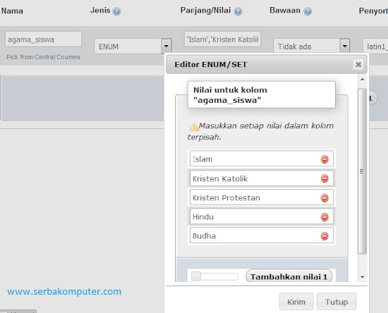 Untuk mengeset tipe data ENUM, Anda cukup mengeset data yang ditambahkan di dalam tabel ke tipe ENUM, kemudian untuk memasukan value/nilainya klik Edit ENUM/SET Values. Jika ingin menambahkan nilai ENUM yang ada, Anda bisa klik tambahkan nilai, kemudian masukan nilai ENUM yang diinginkan. Untuk lebih jelasnya lihat gambar dibawah ini: