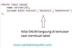 Pada query diatas, kita mendefinisikan kolom jurusan pada tabel siswa dengan tipe ENUM dan langsung menentukan nilainya, yaitu : ekonomi, akutansi, kedokteran. Jadi ketika kita mencoba menginput data baru, maka nilainya harus sama sesuai pilihan nilai yang sudah ditentukan, jika tidak sesuai maka akan terjadi error.