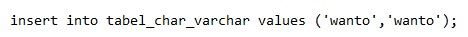Sebagai contoh kita akan membuat sebuah tabel yang bertipe data CHAR dan VARCHAR. Silahkan Anda buat database terlebih dahulu, kemudian ikuti query dibawah ini: